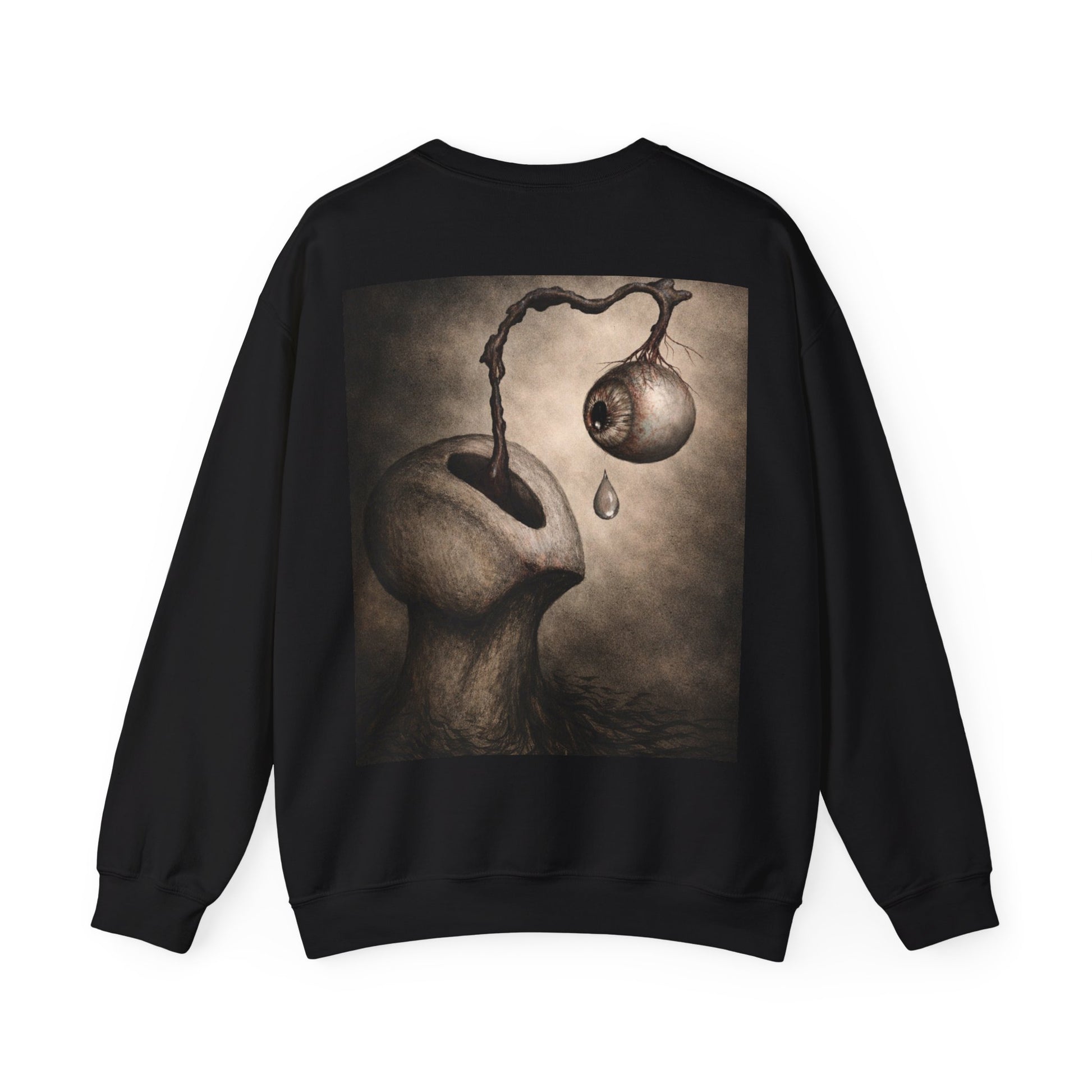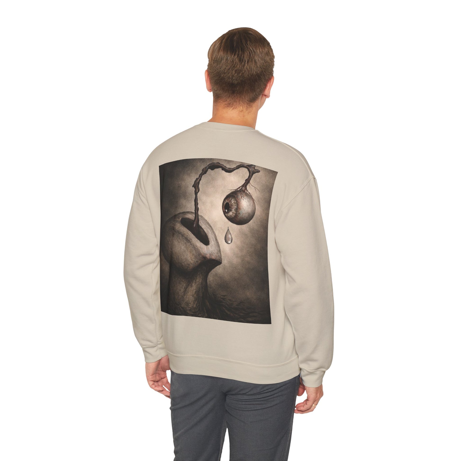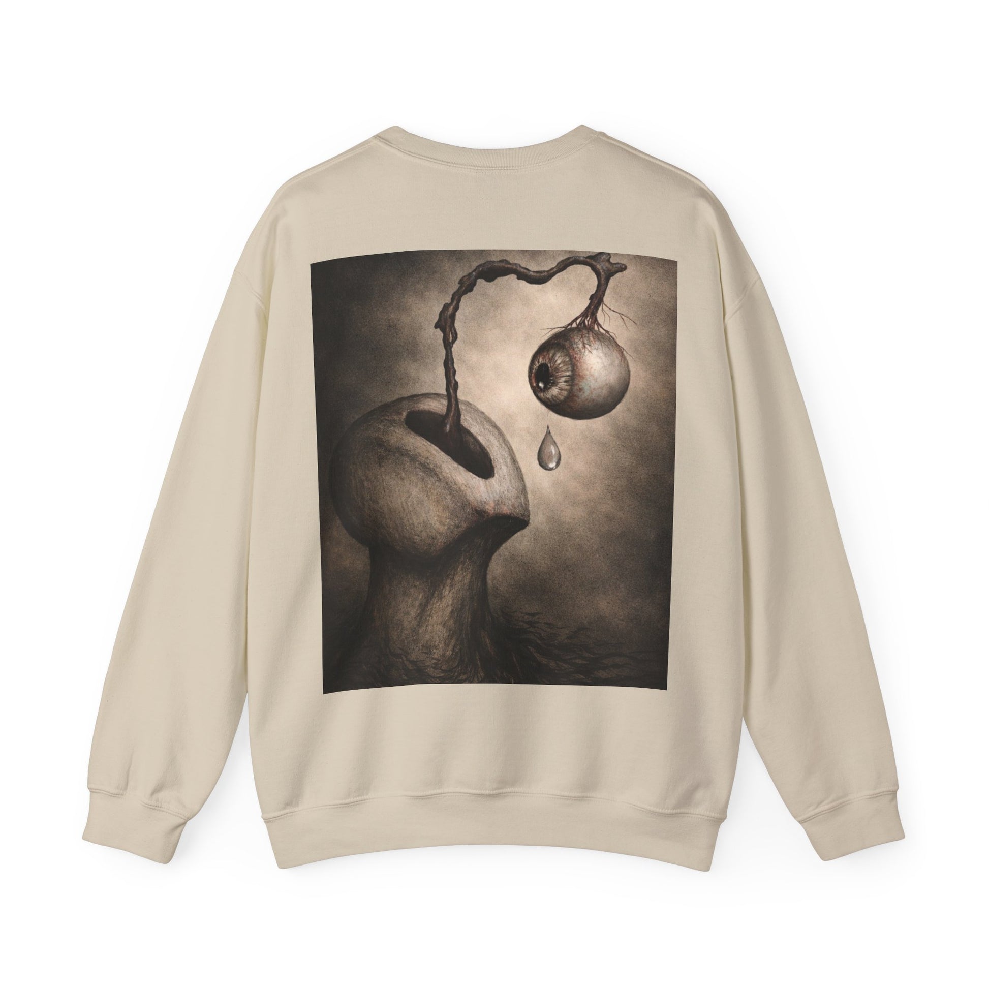 This cozy crewneck sweatshirt carries a quiet, uncanny mood — a soft, substantial canvas for surreal, moody artwork. The thick 50/50 cotton-poly blend feels warm and broken-in without bulk. On the back, a haunting illustration — an organic, dreamlike figure with a dripping, detached orb — invites a second look and lingers in the mind. Wear it on slow evenings, gallery nights, or when you want your outfit to tell a story without saying a word. The classic cut and ribbed neckline keep the silhouette clean while the durable double-needle stitching stands up to repeated wear. Subtle production details — DTF inner neck labels and OEKO‑TEX dyes — make it comfortable and responsibly made.
