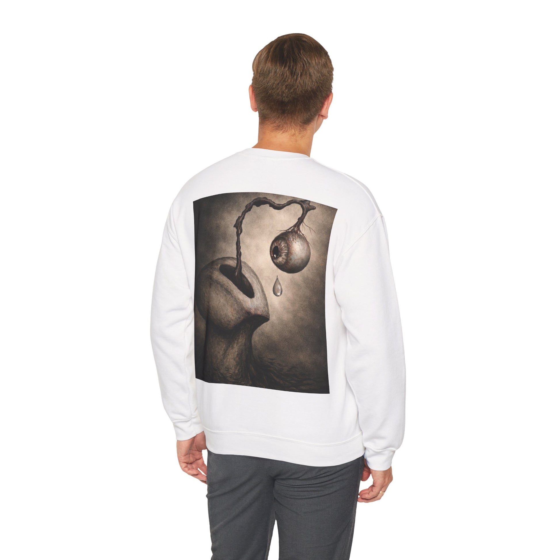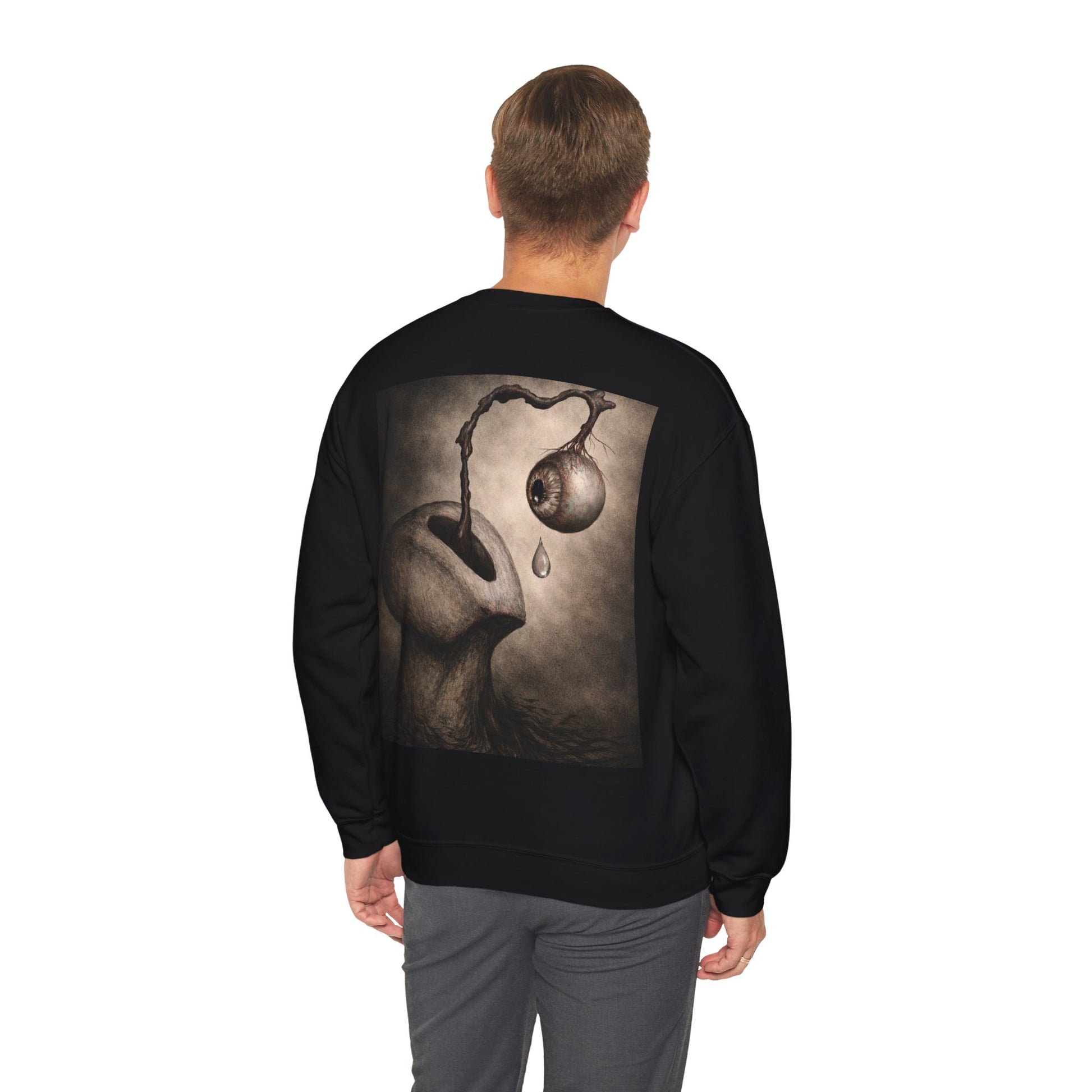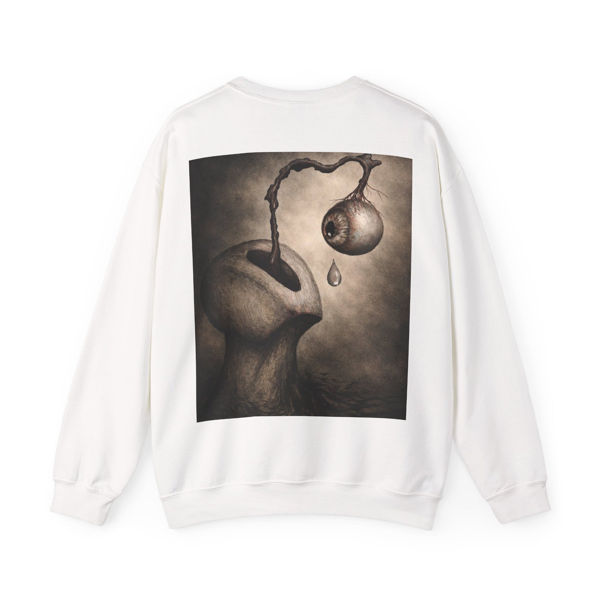 This cozy crewneck sweatshirt carries a quiet, uncanny mood — a soft, substantial canvas for surreal, moody artwork. The thick 50/50 cotton-poly blend feels warm and broken-in without bulk. On the back, a haunting illustration — an organic, dreamlike figure with a dripping, detached orb — invites a second look and lingers in the mind. Wear it on slow evenings, gallery nights, or when you want your outfit to tell a story without saying a word. The classic cut and ribbed neckline keep the silhouette clean while the durable double-needle stitching stands up to repeated wear. Subtle production details — DTF inner neck labels and OEKO‑TEX dyes — make it comfortable and responsibly made.
