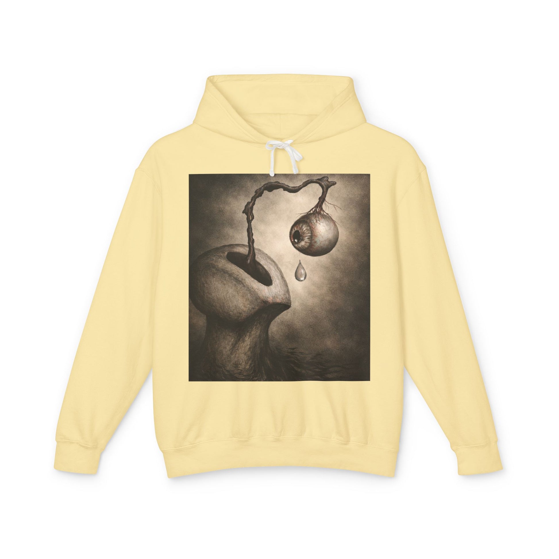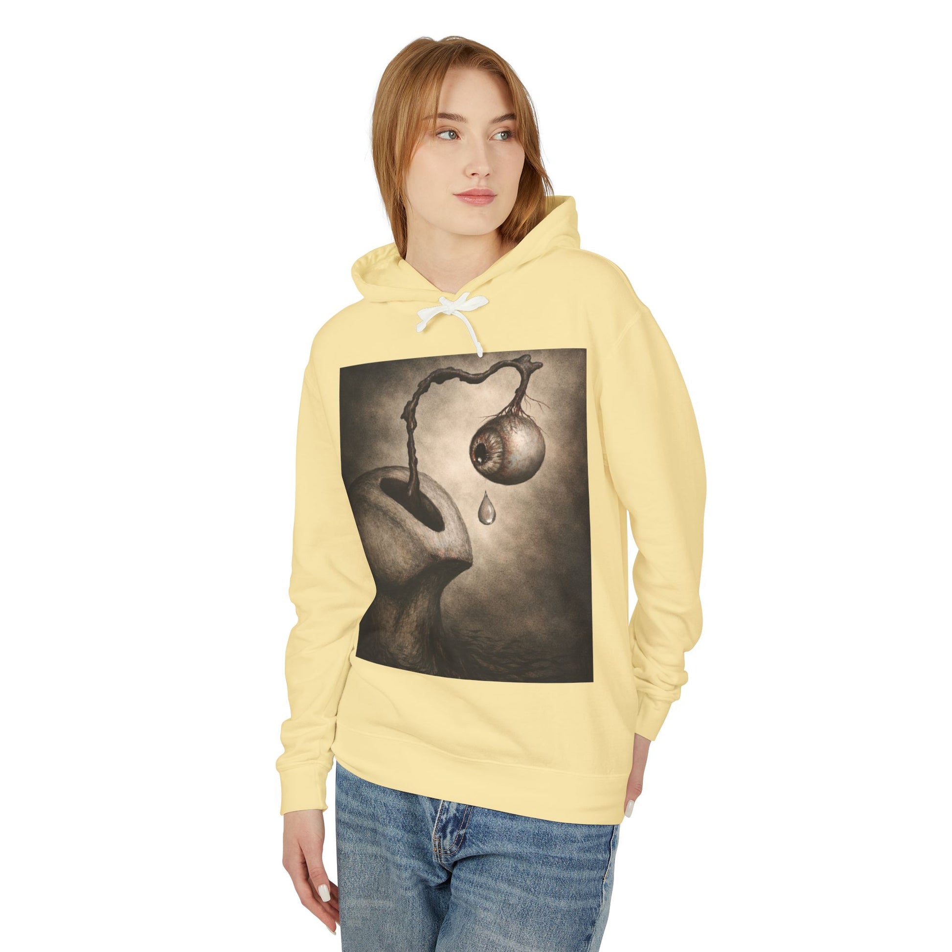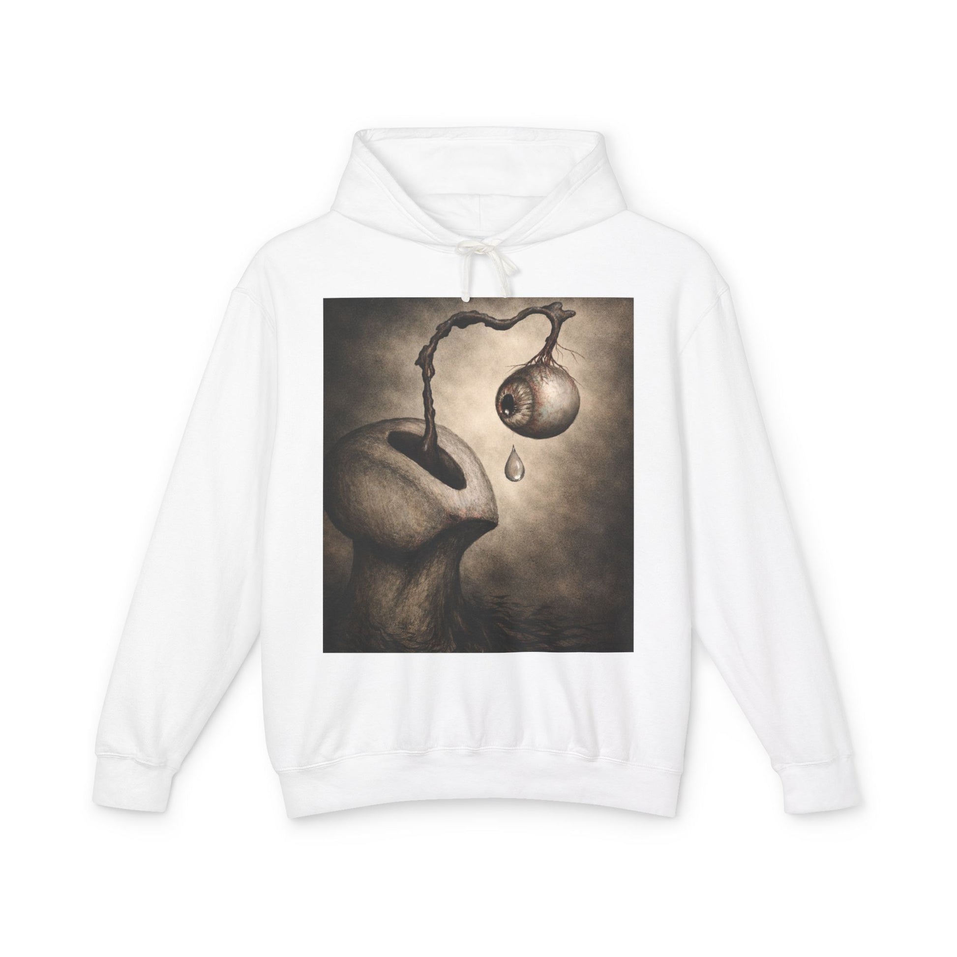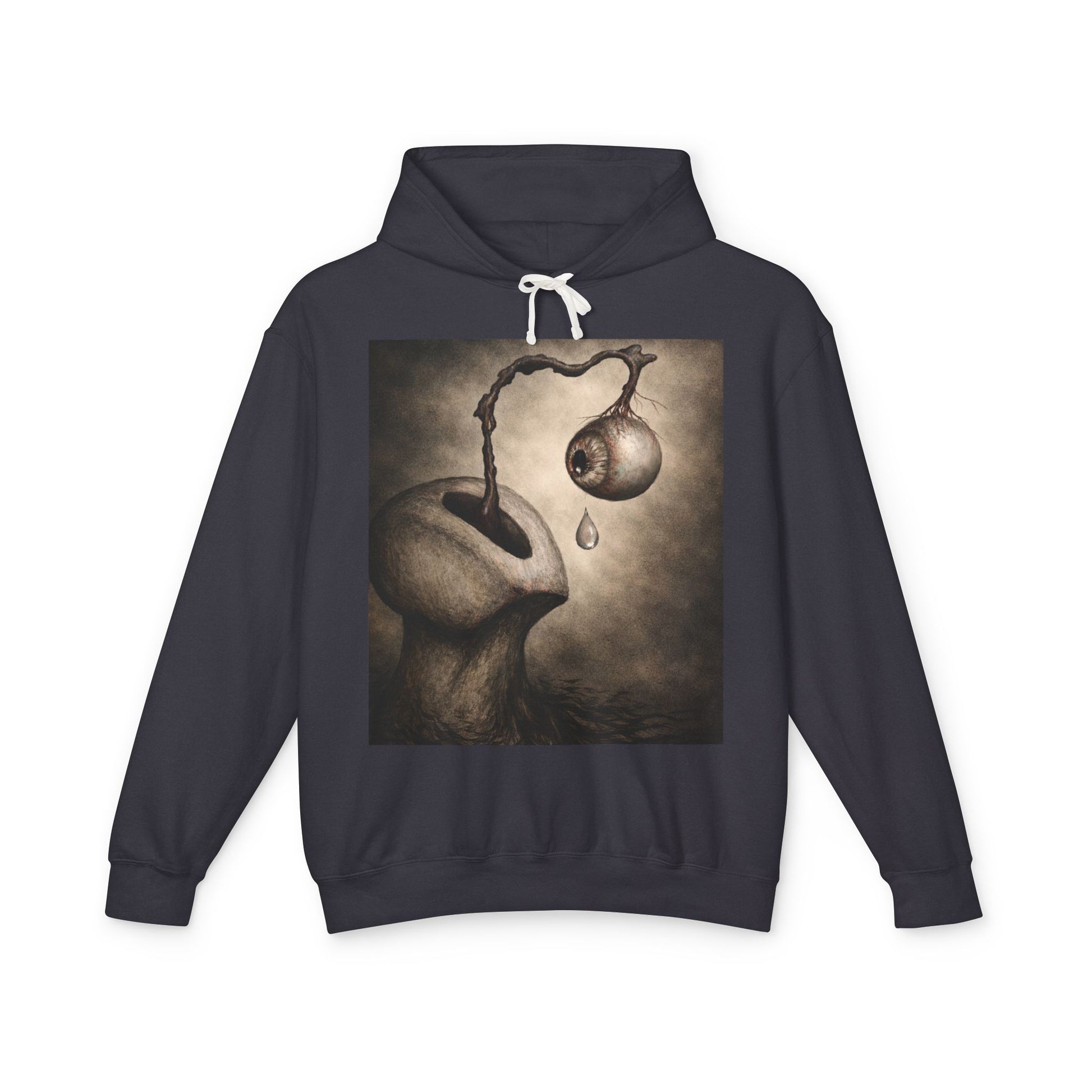 The cozy crewneck sweatshirt carries a quiet, surreal mood — a wearable canvas for dreamy, moody artwork. The haunting illustration on the back, featuring an organic, dreamlike figure with a dripping orb, captures attention and lingers in the mind. Perfect for gallery nights, evening walks, or slow moments when your outfit tells a story silently.